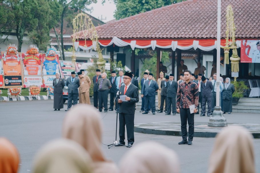 Bupati Banyumas Sadewo Tri Lastiono memimpin apel pagi perdana di halaman Halaman Pendopo Si Panji Purwokerto pada Senin (3/3/2025). Apel ini menjadi momentum pertama sejak dirinya bersama Wakil Bupati Dwi Asih Lintarti resmi dilantik oleh Presiden Prabowo Subianto sebagai Bupati dan Wakil Bupati Banyumas Periode 2025-2030.