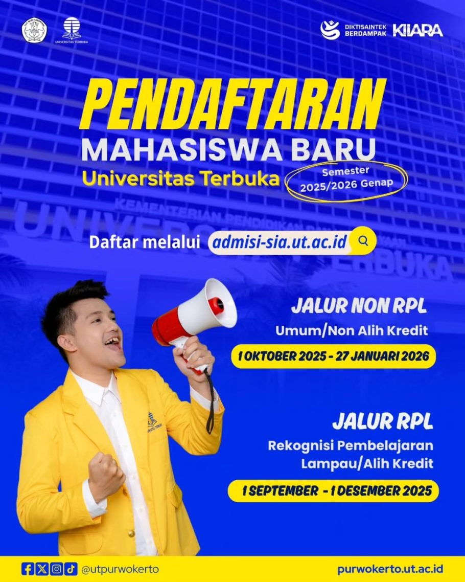 Penerimaan mahasiswa baru Universitas Terbuka (UT) Purwokerto resmi dibuka sejak1 September – 1 Desember 2015 bagi jalur RPL dan1 Oktober – 27 Januari 2026 bagi Jalur Non RPL.