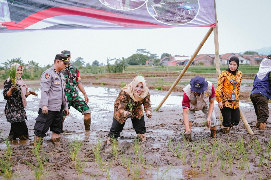 Dalam rangka mendukung ketahanan pangan nasional dan menyukseskan gerakan tanam padi serentak di 14 provinsi, Wakil Bupati Banyumas Dwi Asih Lintarti ikut terjun langsung dalam penanaman padi varietas Mentik Wangi di area pesawahan Desa Tambaksari, Kecamatan Kembaran dengan luas 4.900 m² pada Rabu (23/4/25).